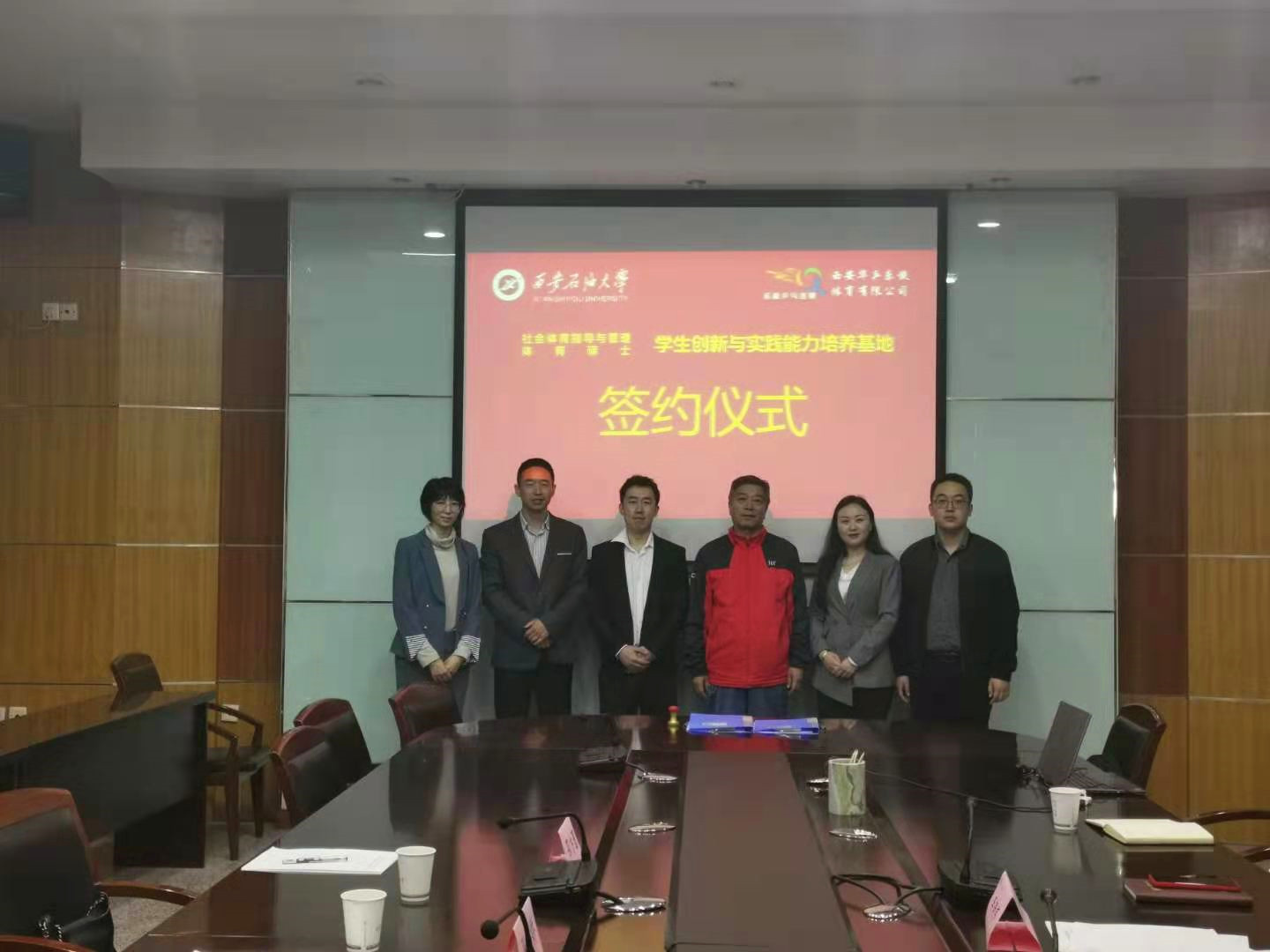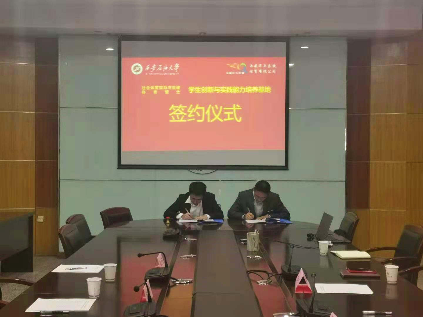 2021年4月27日上午,体育系与西安华乒乐旋体育有限公司建立员工创新与实践能力培养基地签约仪式在雁塔校区第四会议室举行,乐旋集团人事总监张小娇、西安乐旋连锁总经理徐小松、体育系党总支书记倪振文、系主任李寿邦以及系办公室、教学办、学管办负责人参加了签约仪式。