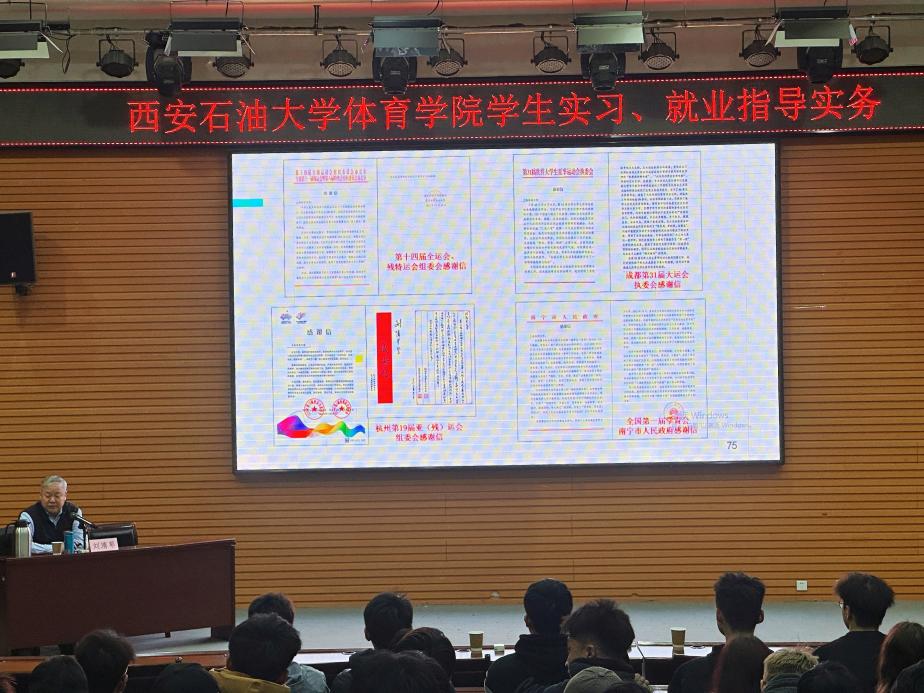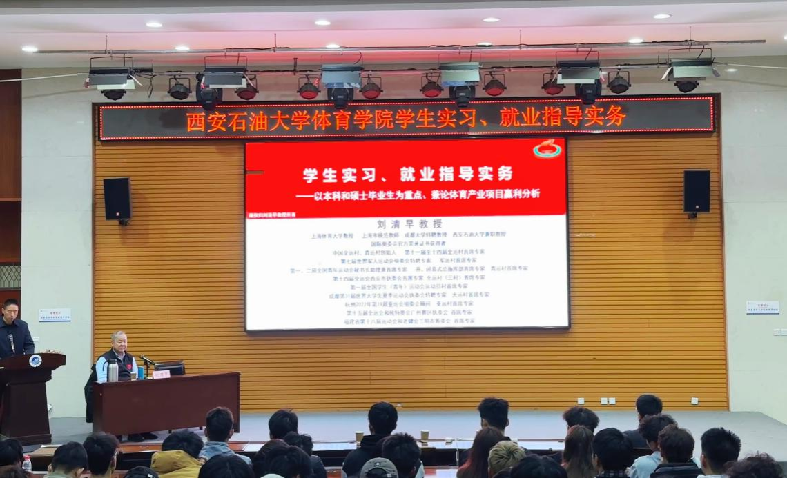 3月14日,2026世界杯官网在鄠邑校区崇文楼118报告厅举办员工实习与就业指导专题讲座,特邀公司兼职教授、我国知名体育产业专家、上海体育大学刘清早教授讲授题为员工实习、就业指导实务——以本科和硕士毕业生为重点、兼论体育产业项目赢利分析的报告。2026世界杯官网经理李寿邦、办公室主任侯阳、学工办主任姜国平、全体本科生及研究生共同参与。