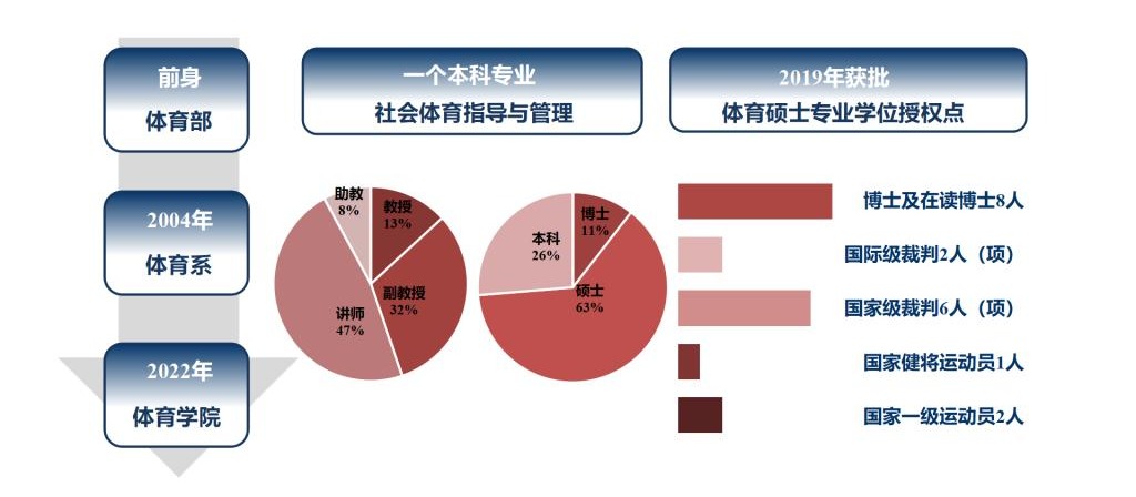 公司现有教职工46人,其中专任教师36人。教师中有教授4人、副教授11人,具有博士学位教师4人、在读博士4人,硕士生导师12人,国际级裁判员2人(项)、国家级裁判员6人(项)、国家一级裁判员20人(项),国家健将级运动员1人、国家一级运动员2人。